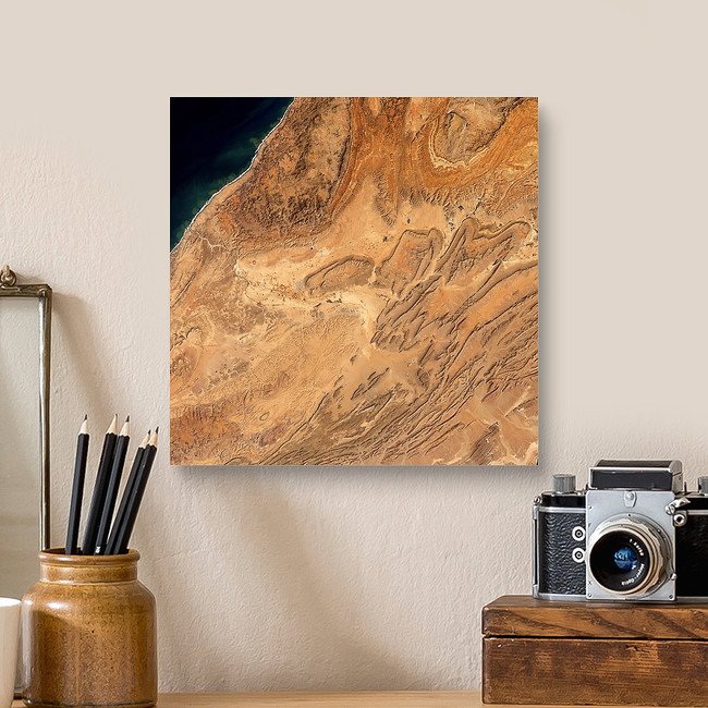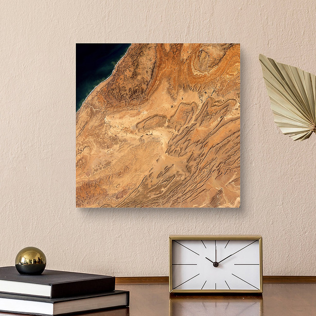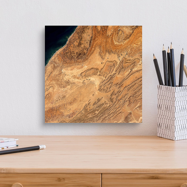 Anti-Atlas mountains, Morocco, satellite image. North is at top. This image covers an area around 70 kilometres across, and shows the south-western end of the Anti-Atlas Mountains. Most of the landscape consists of eroded mountains and rock structures called mesas (centre), and narrower mountain ridges (lower right). The landscape has formed over millions of years of erosion. Most of the landscape is a barren desert, but centre-pivot irrigation and agriculture occurs in the valley of the river flowing from centre to the Atlantic coast at upper left. At centre left, just to the left of one of the large mesas, is the city of Guelmine (grey). Image obtained on 19 March 2002 by the ETM+ sensor on the Landsat 7 satellite.