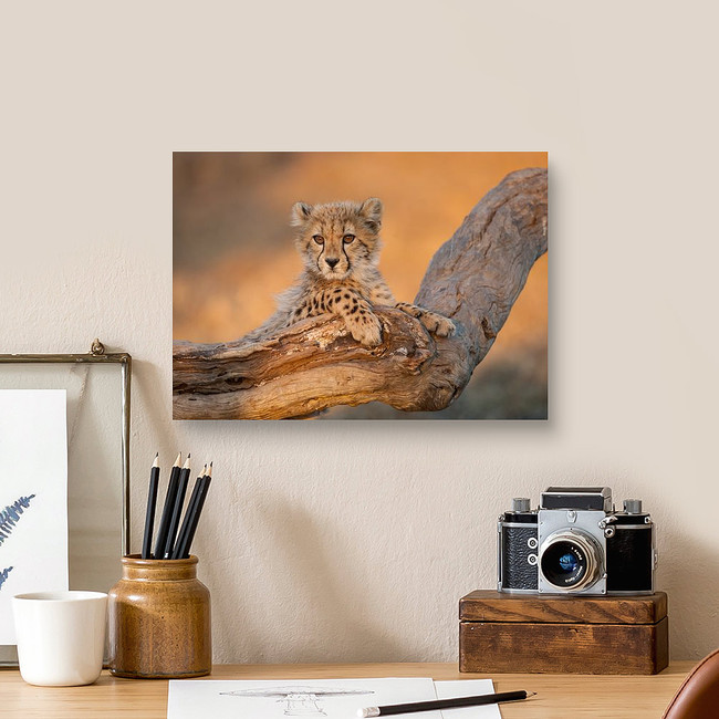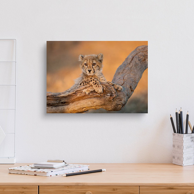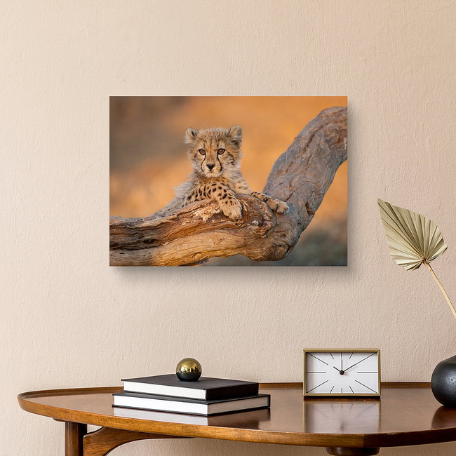 Baby Cheetah With Big Eyes Portrait Sitting On A Dead Log In Kruger... Canvas Print