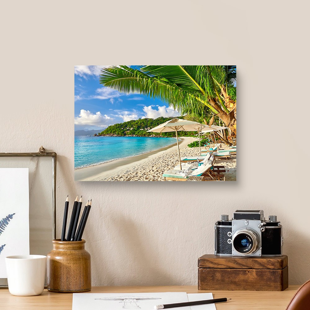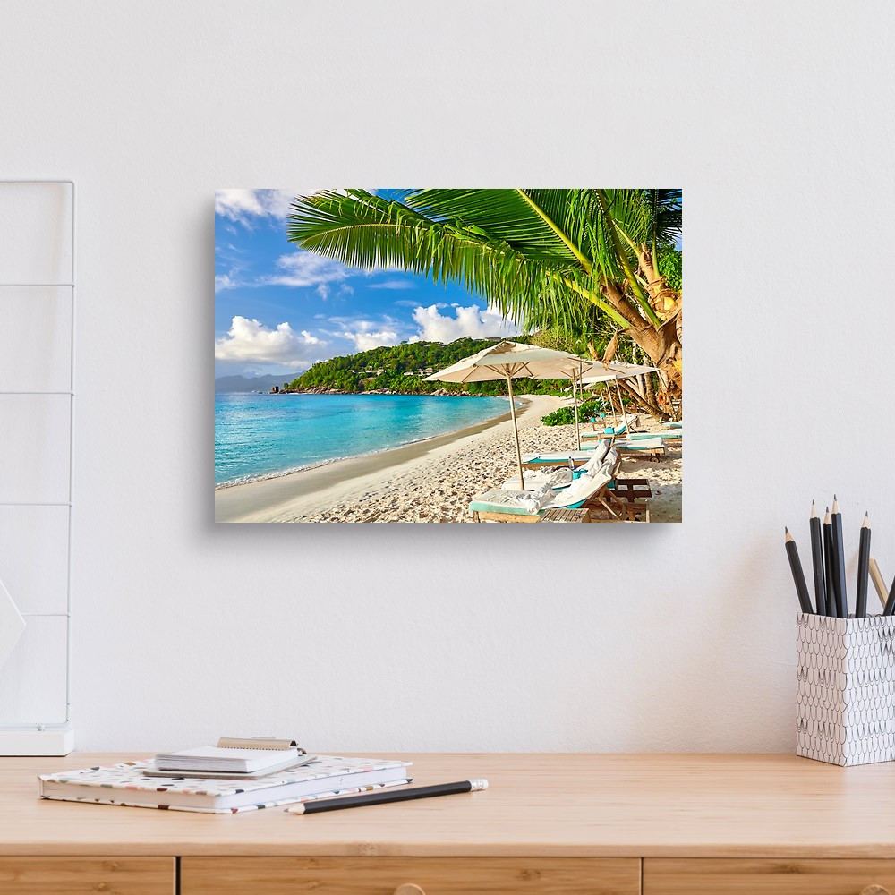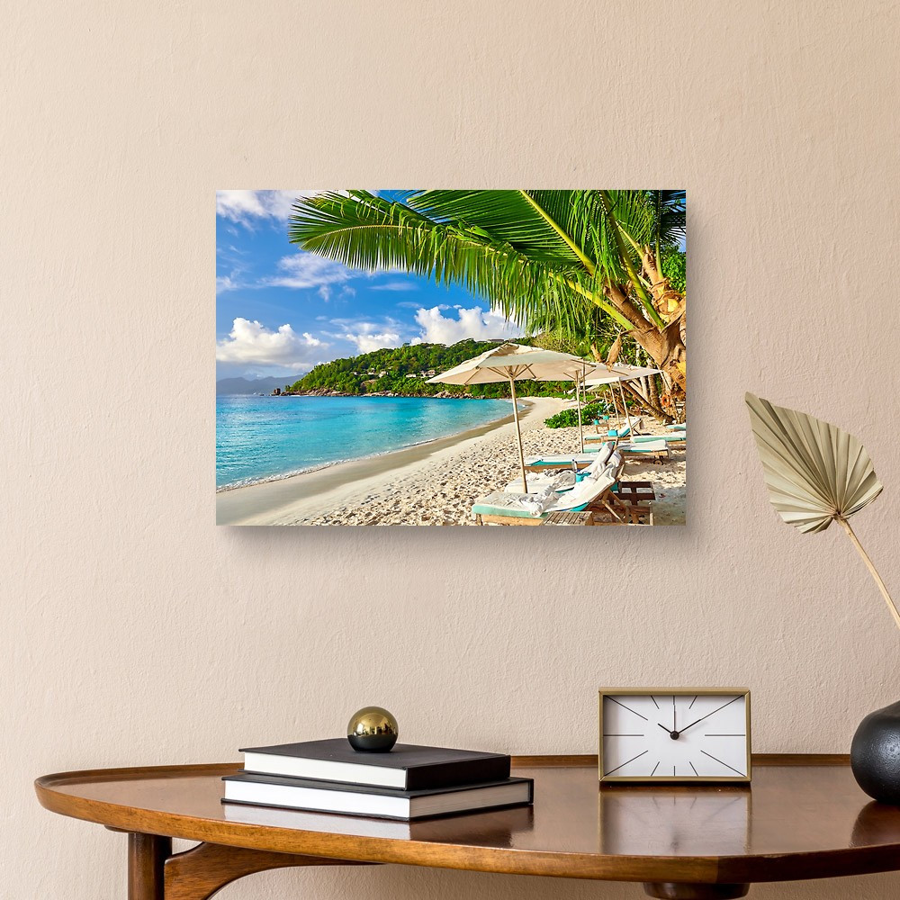 Beautiful Petite Anse Beach With Palm Tree At Seychelles, Mahe Canvas Print