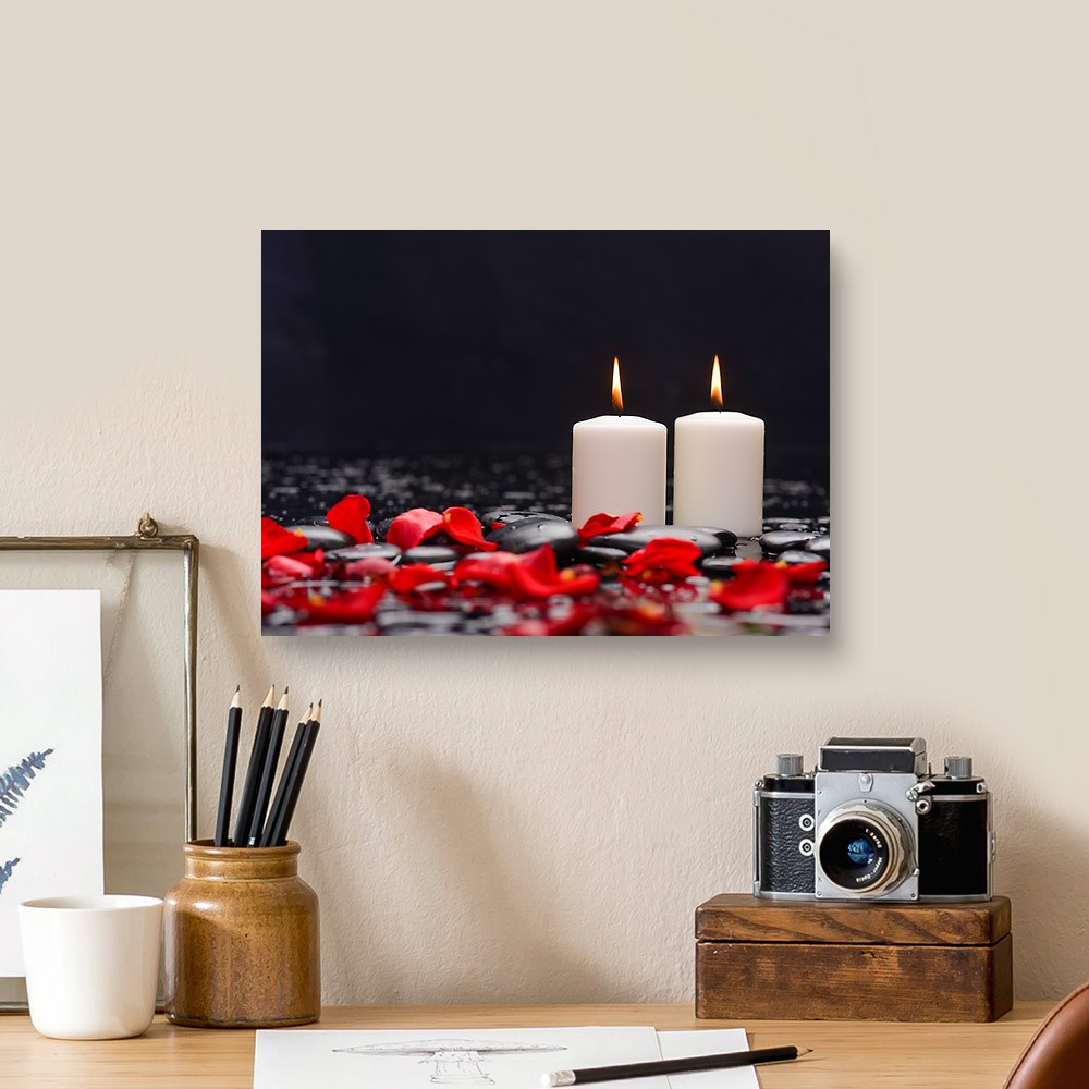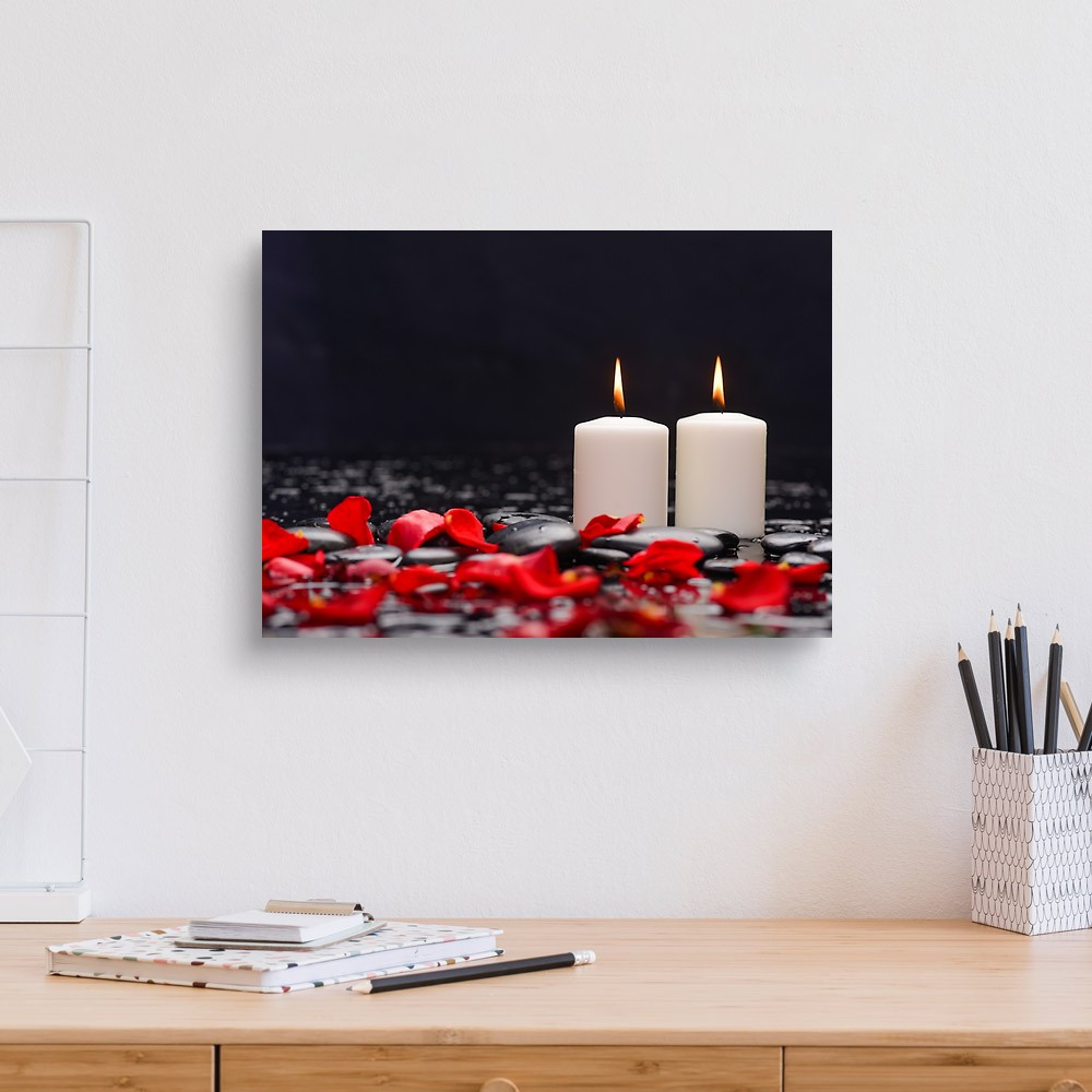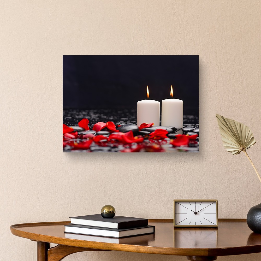 Beautiful Rose ,petals With White Candle And Therapy Stones Canvas Print