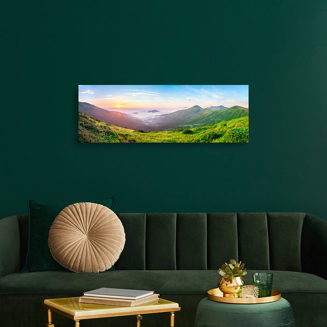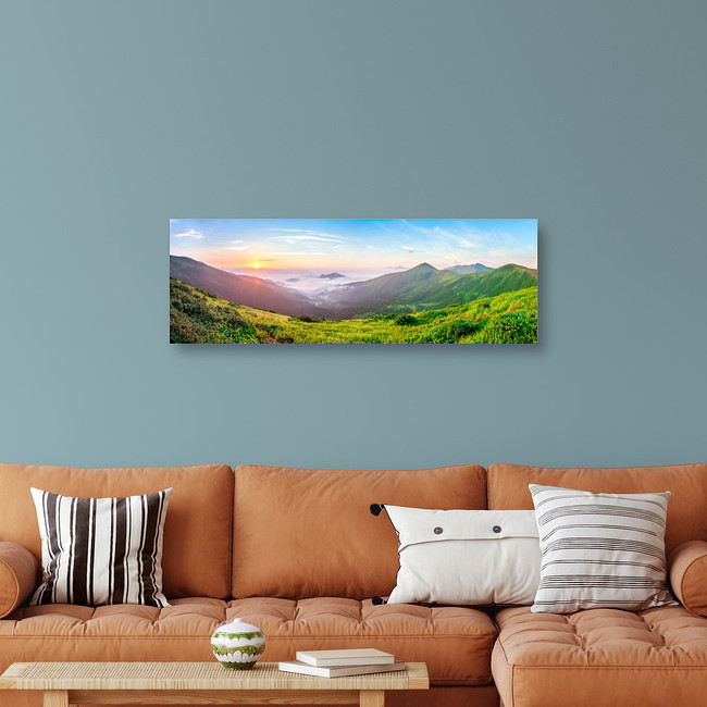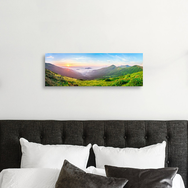 Beautiful Sunrise In Mountains With White Fog Below Panorama Canvas Print