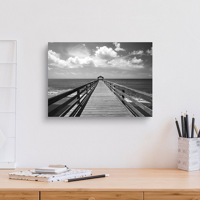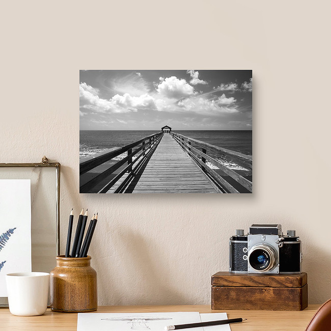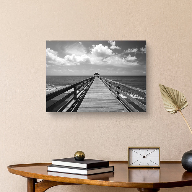 Black and white image of a pier leading out to the ocean water with a covered area at the end Canvas Print