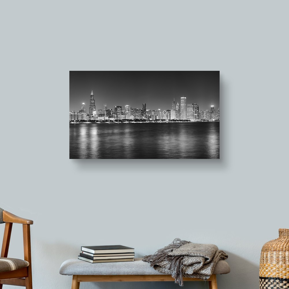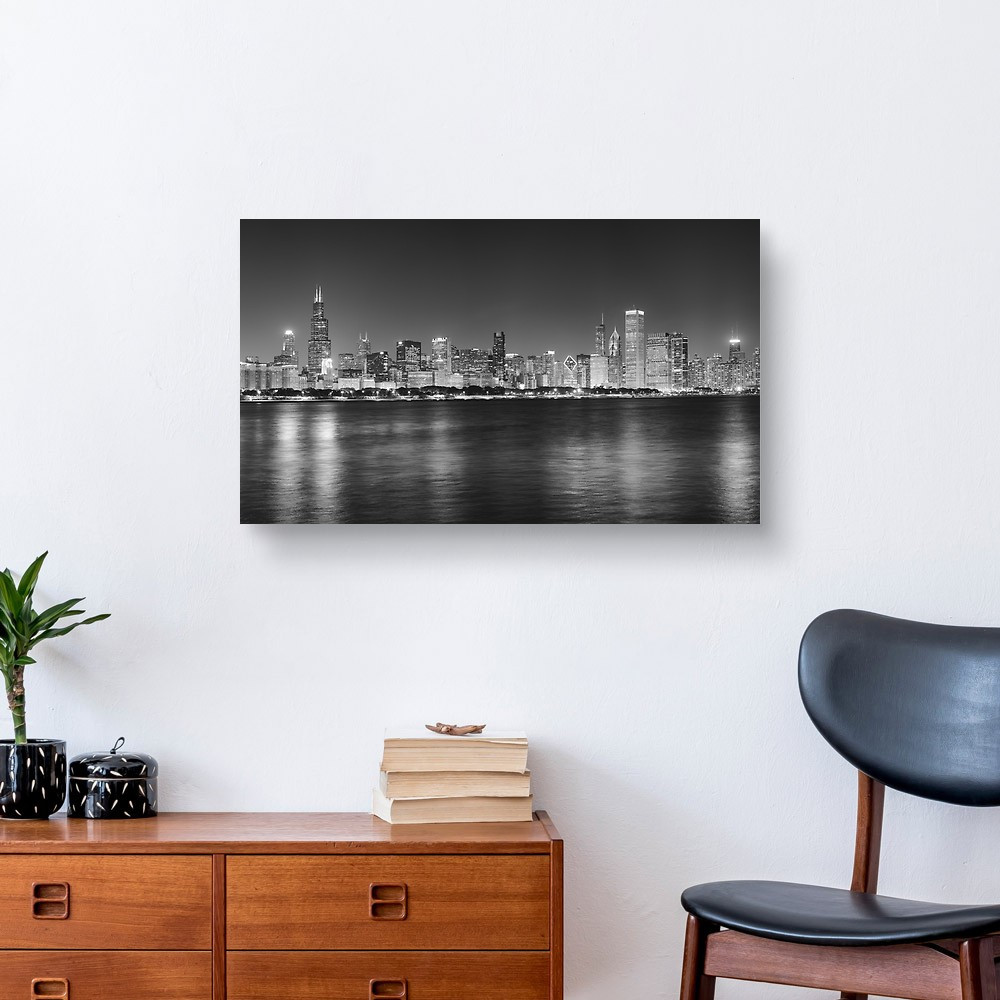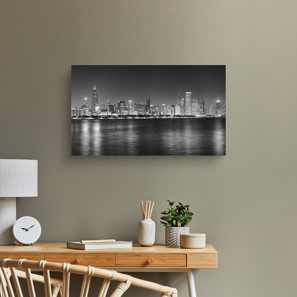 Black And White Night Panoramic Picture Of Chicago City Skyline, USA Canvas Print