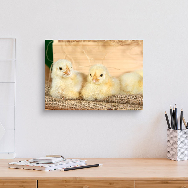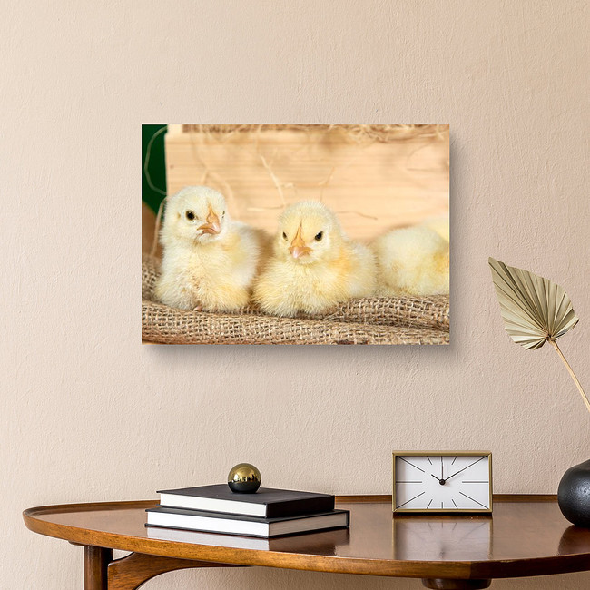 Cute Downy Yellow Newborn Chickens On Hay In A Wooden Box Canvas Print