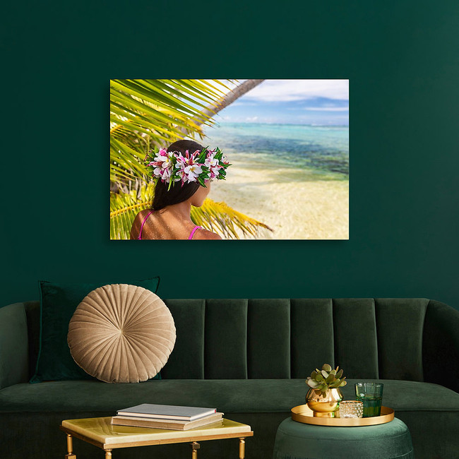 Hawaii beach woman luau dancer relaxing wearing wreath of fresh flowers on Tahiti Bora Bora, French Polynesia.