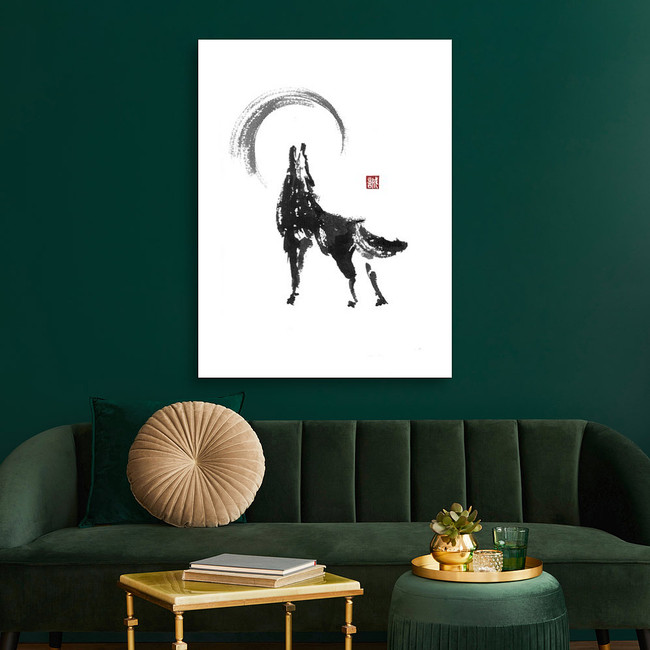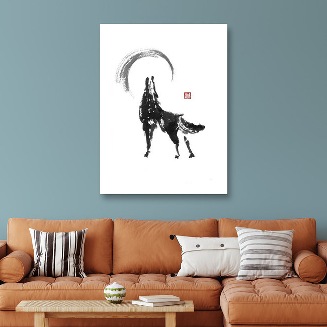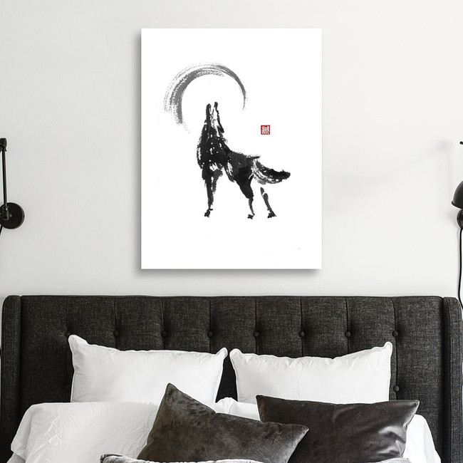 Howling Wolf Japanese Style Original Sumi-e Ink Painting Canvas Print