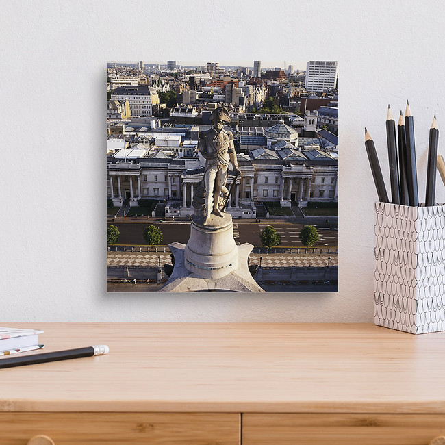 Nelson's Column, aerial photograph. Nelson's Column was built between 1840 and 1843 to commemorate Admiral Horatio Nelson, who died defeating the Spanish Navy at the Battle of Trafalgar. The statue is 5.5m high and stands on a column 56m high. The buidling seen immediately the statue is the National Gallery. Photographed in Trafalgar Square, London, UK.