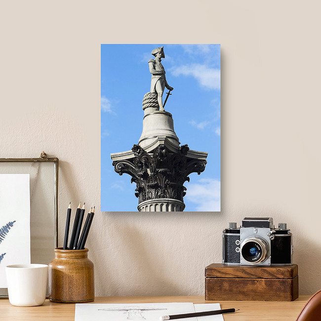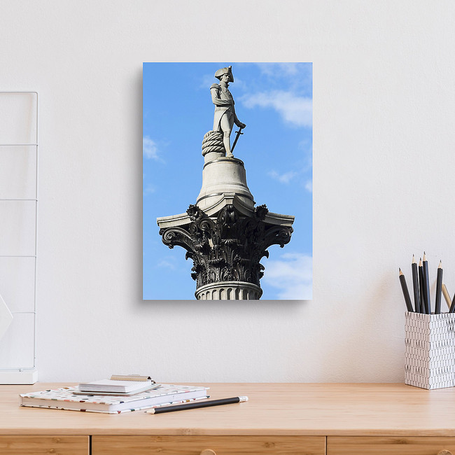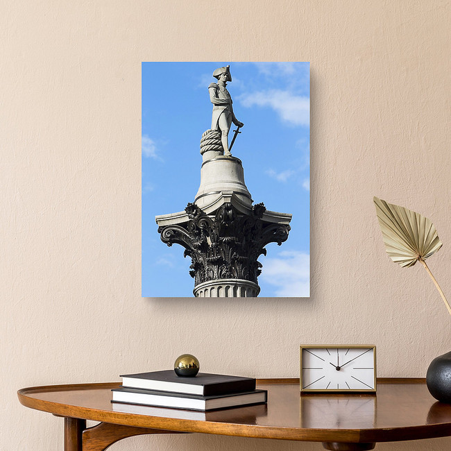 Nelson's Column statue. Nelson's Column was built to commemorate the death of Admiral Horatio Nelson at the Battle of Trafalgar in 1805. It was designed by the architect William Railton in 1838 and was built between 1840 and 1843. The statue of Lord Nelson (5.5 metres tall) was sculpted from sandstone by Edward Hodges Baily. The Corinthian capital elements below are made from bronze. The entire monument is 53 metres tall. Photographed on 13 August 2014.