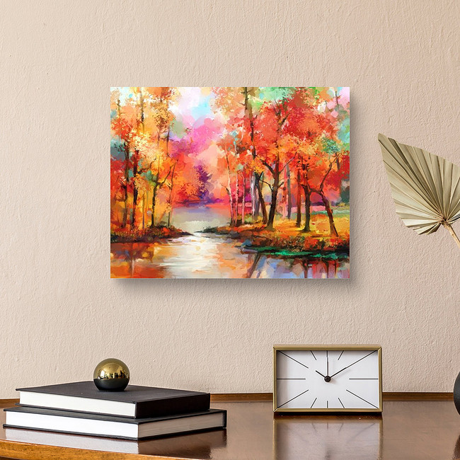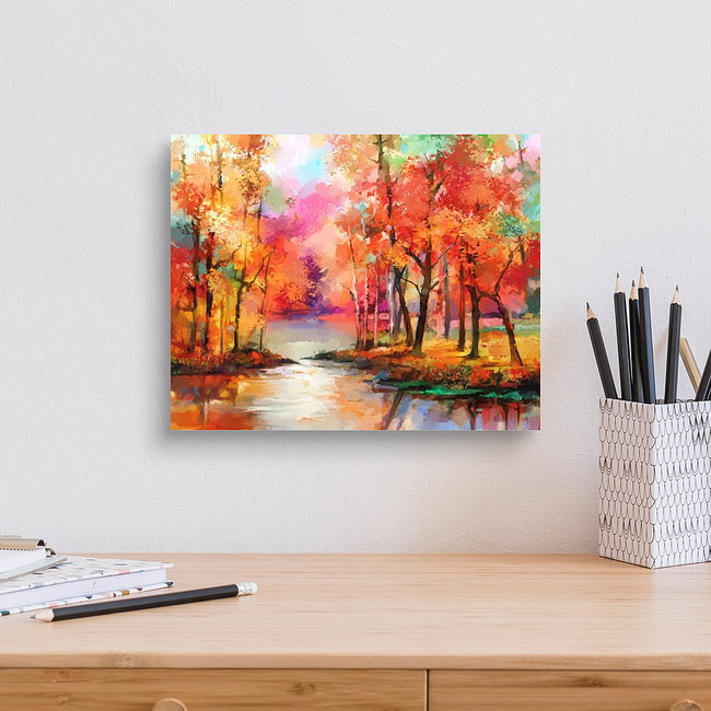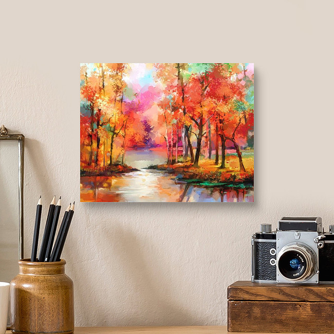 Oil painting colorful autumn trees. Semi abstract image of forest, aspen trees with yellow - red leaf and lake. Autumn, Fall season nature background. Hand Painted Impressionist, outdoor landscape