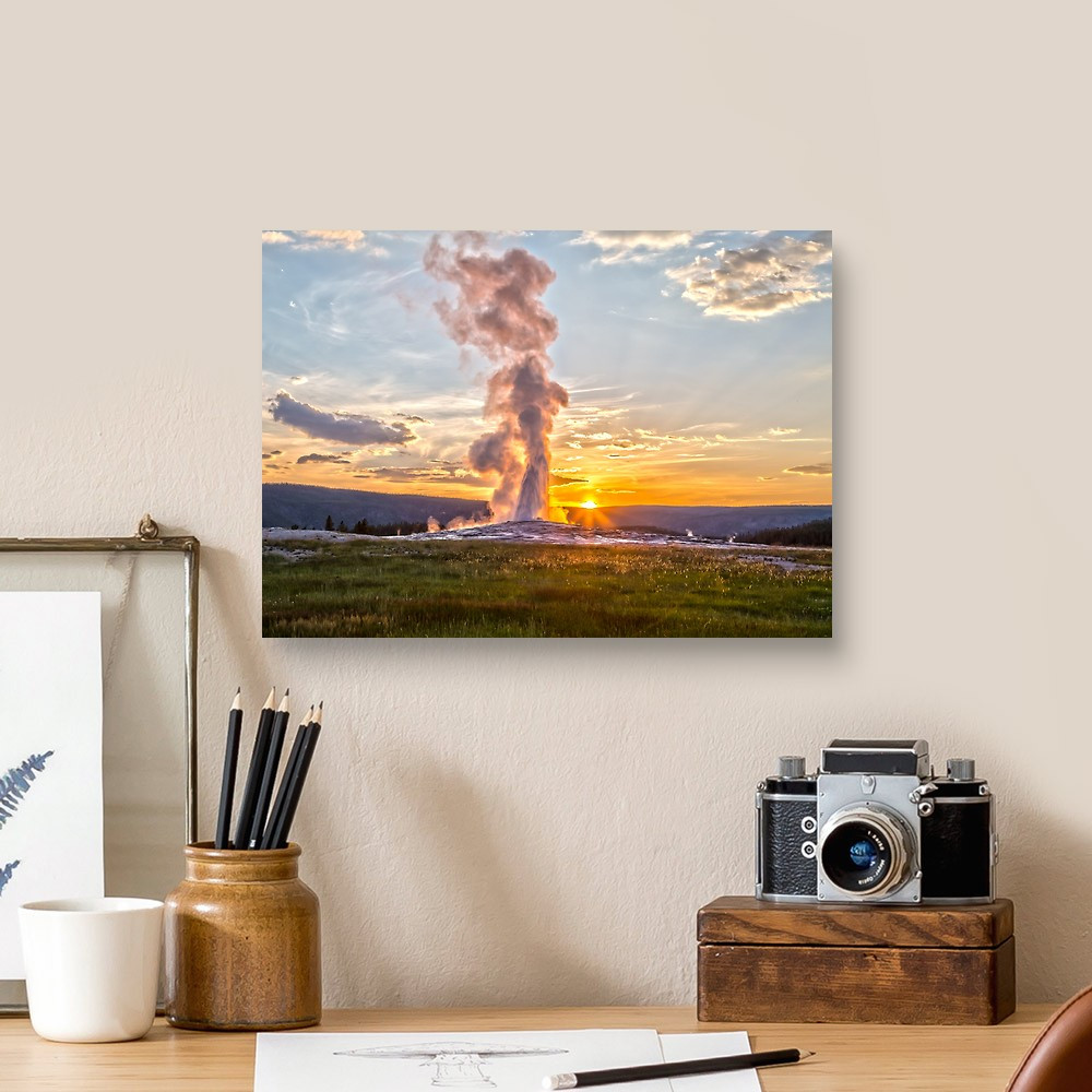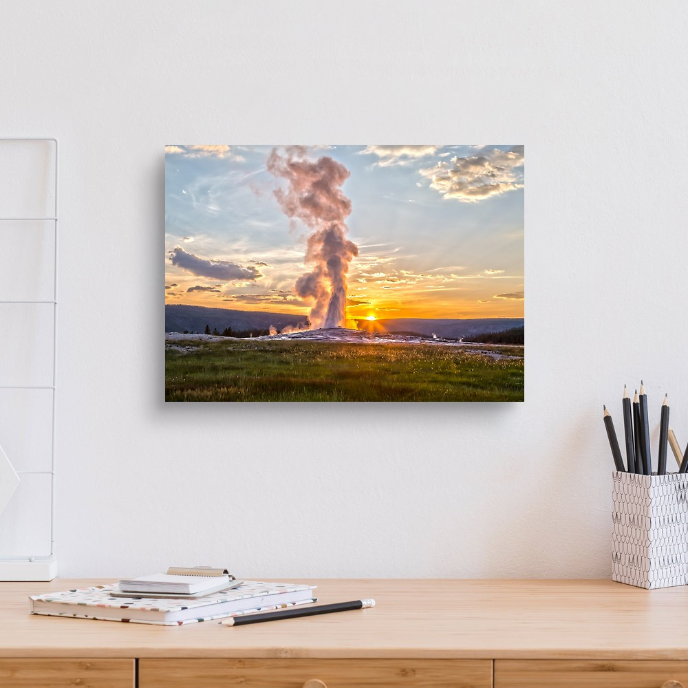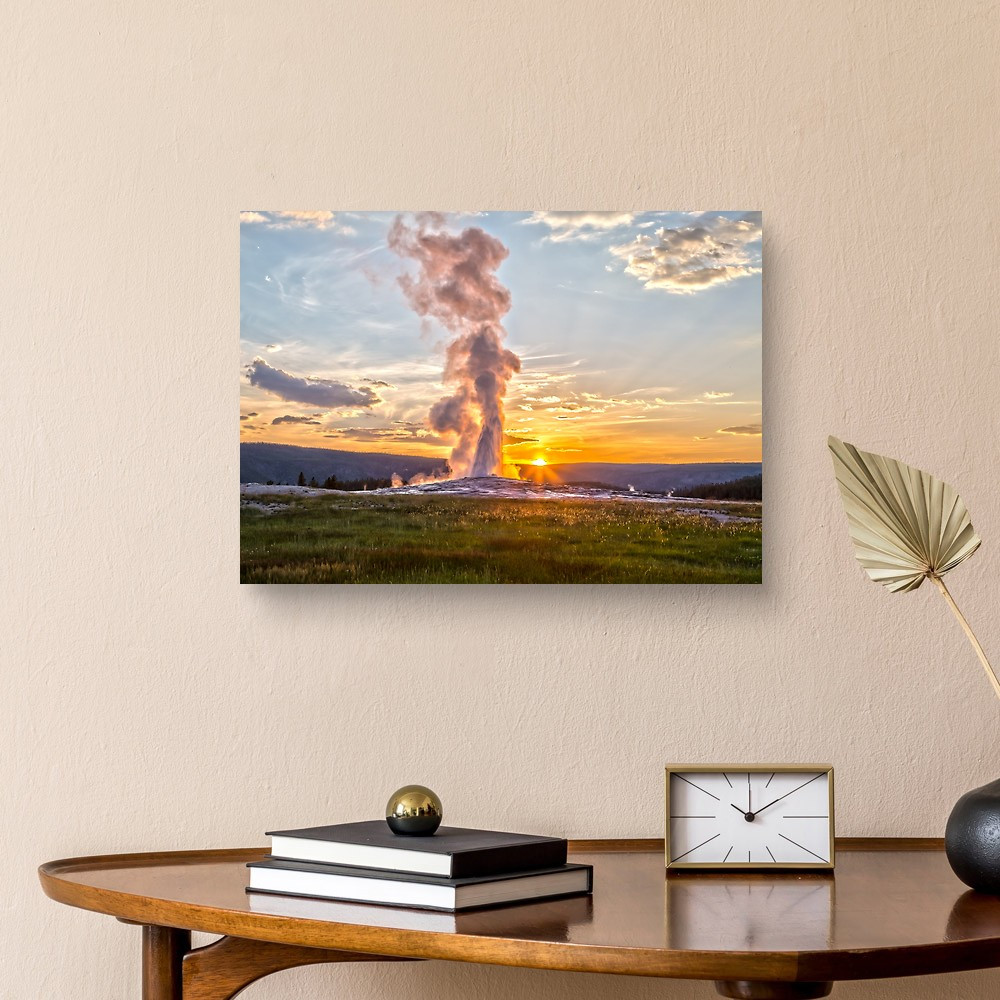 Old Faithful Geyser Eruption In Yellowstone National Park At Sunset Canvas Print