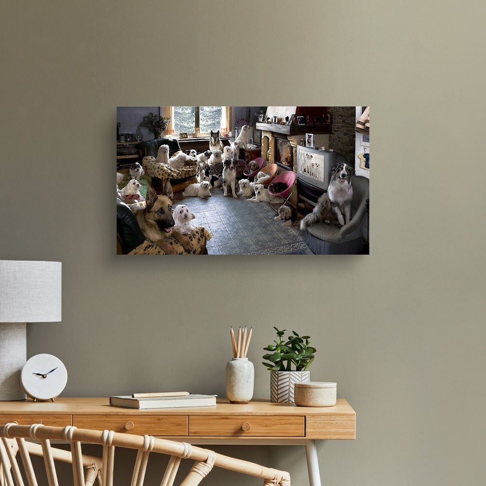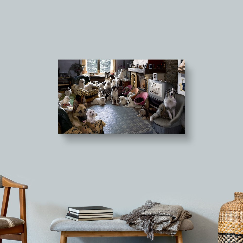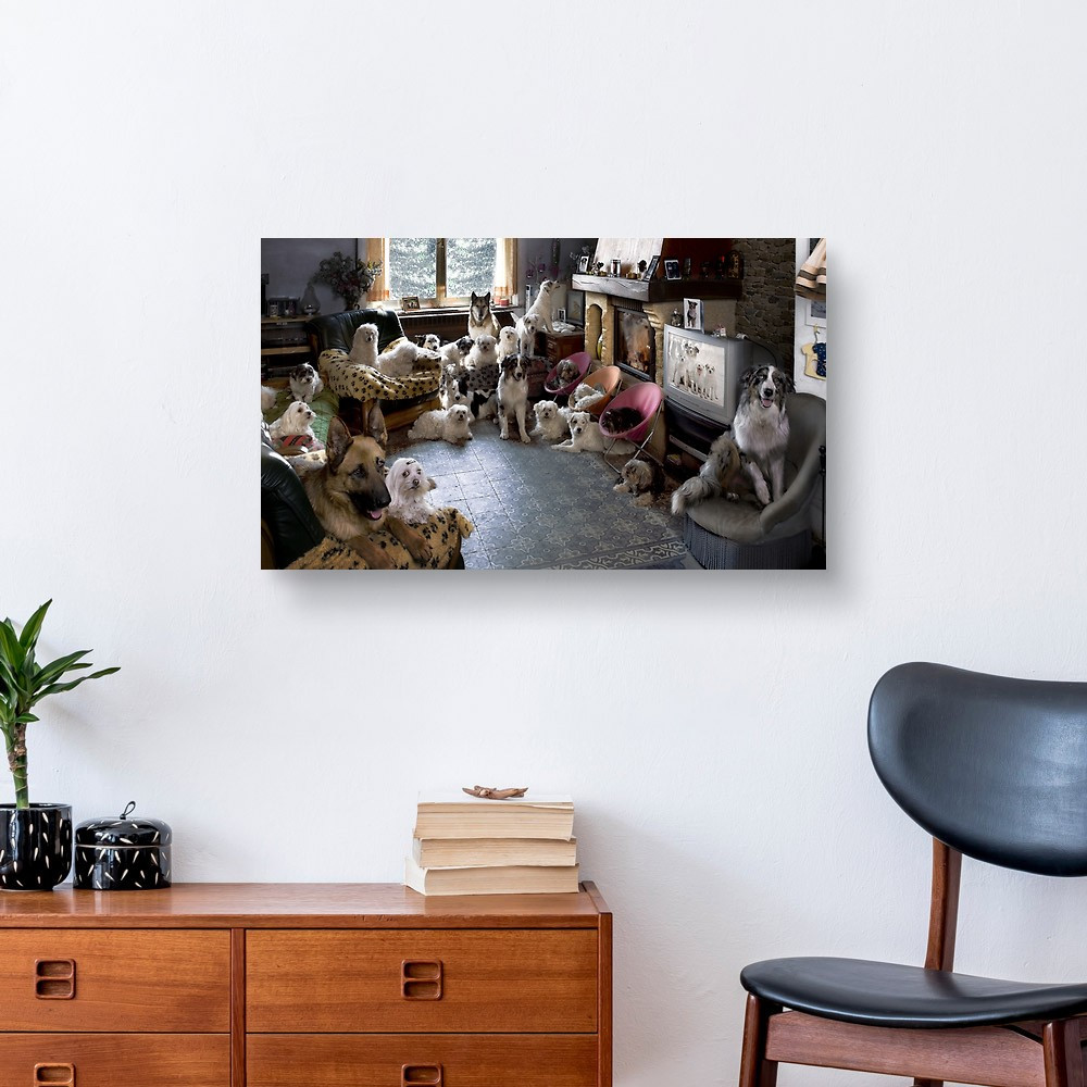 Portrait Of 24 Dogs In A Living Room In Front Of A TV Canvas Print