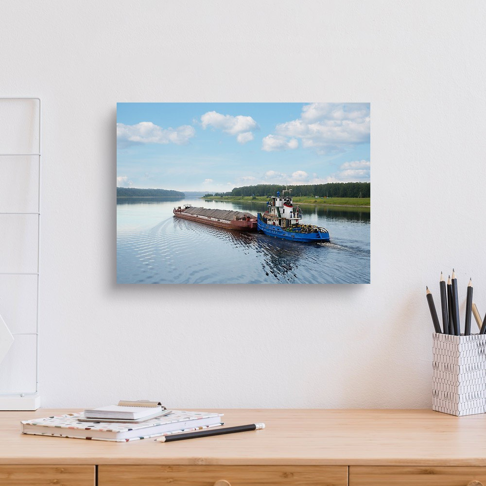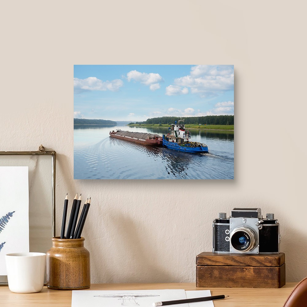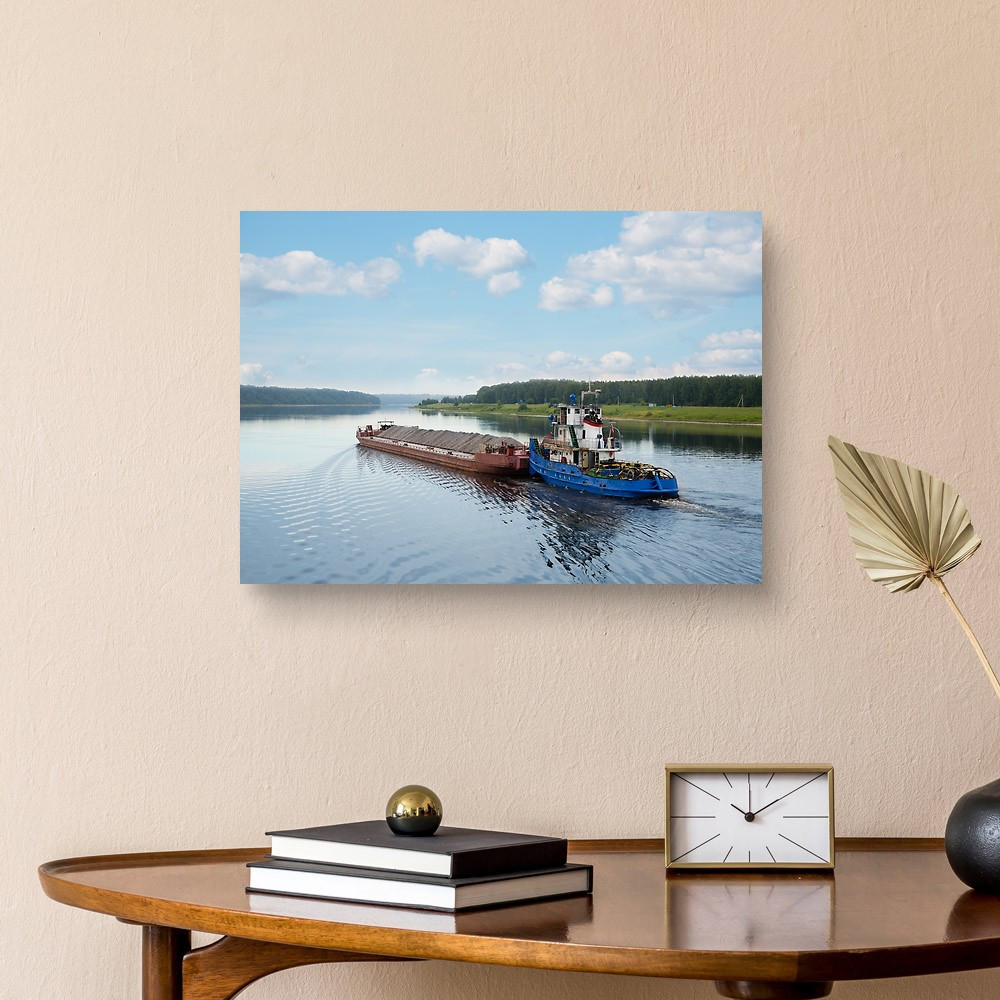 River Tugboat Moves Cargo Barge On The Volga River In The Summer Canvas Print
