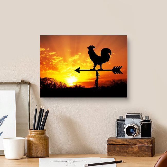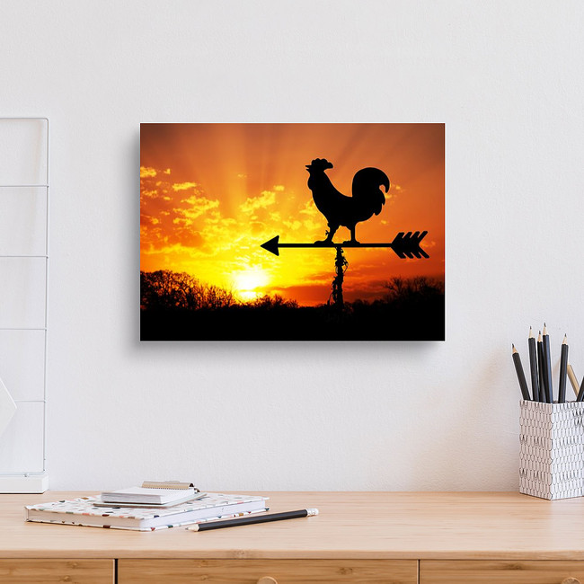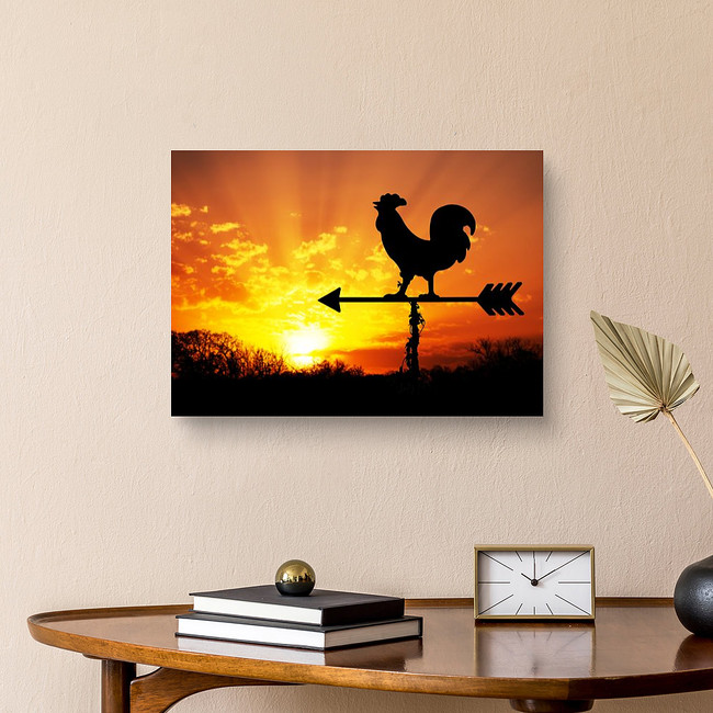 Rooster Weather Vane Against Sunrise With Bright Colors In Clouds Canvas Print