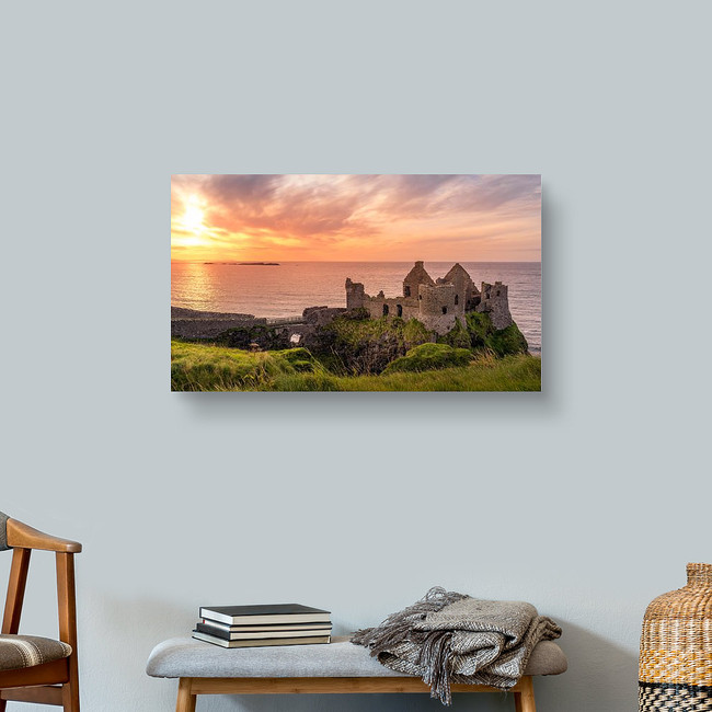 Ruined Medieval Dunluce Castle On The Cliff At Amazing Sunset, Wild Canvas Print