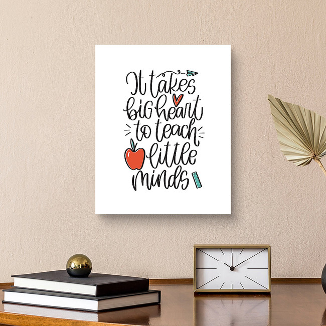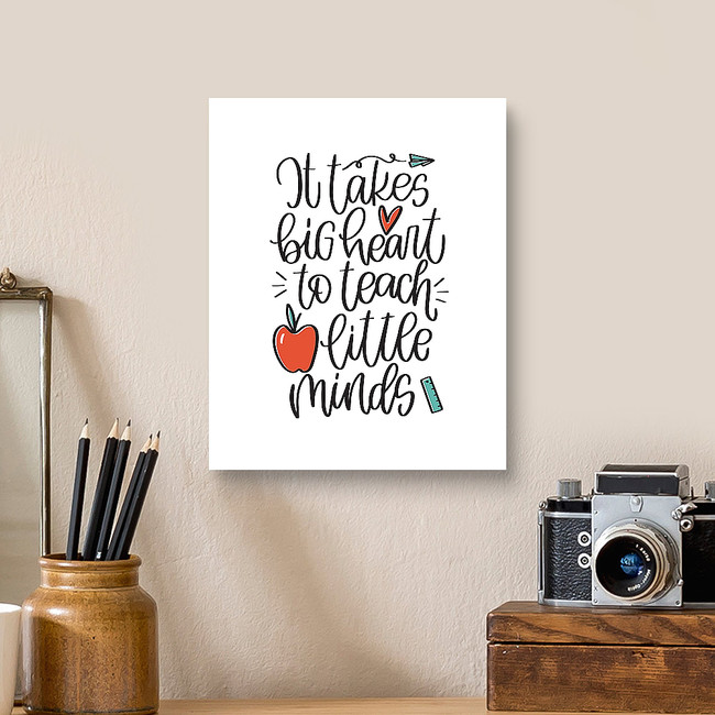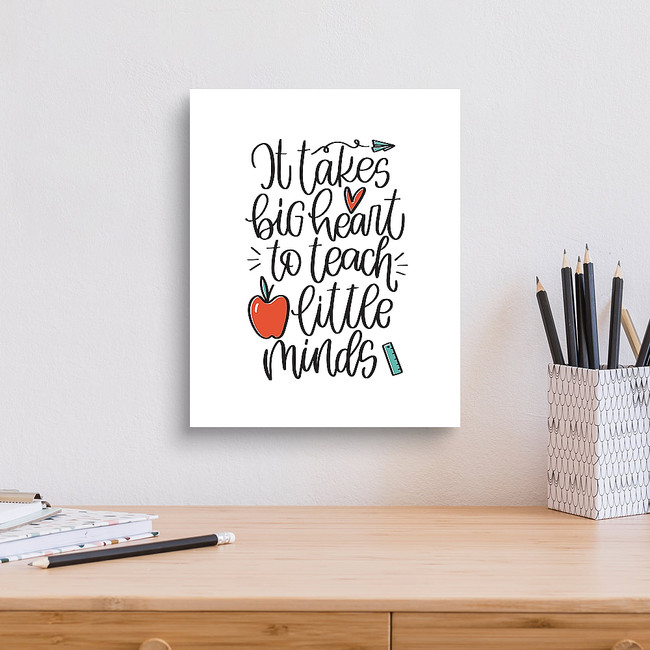 Teacher quote vector design with apple, paper plane and ruler images. It takes big heart to teach little minds calligraphy phrase for a gift decoration or t-shirt iron on.