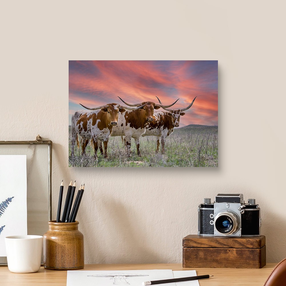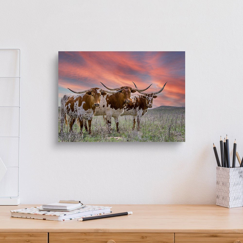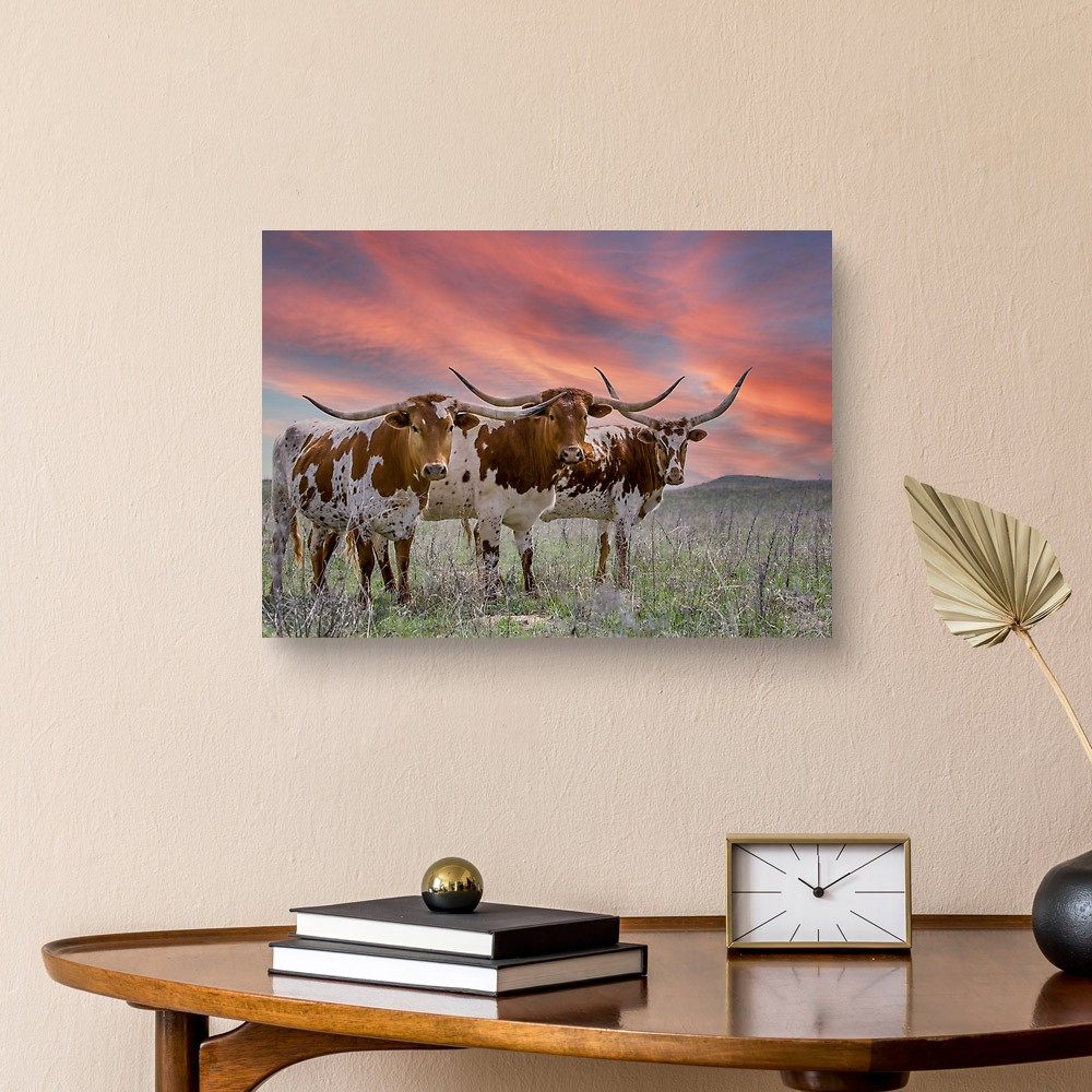 Texas Longhorn Cattle At Sunset In A Pasture In The Oklahoma Canvas Print