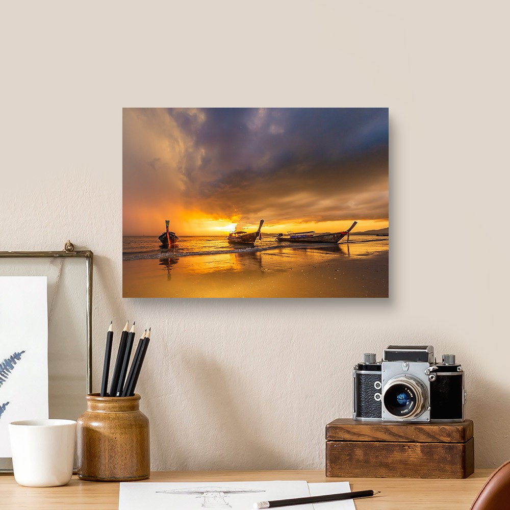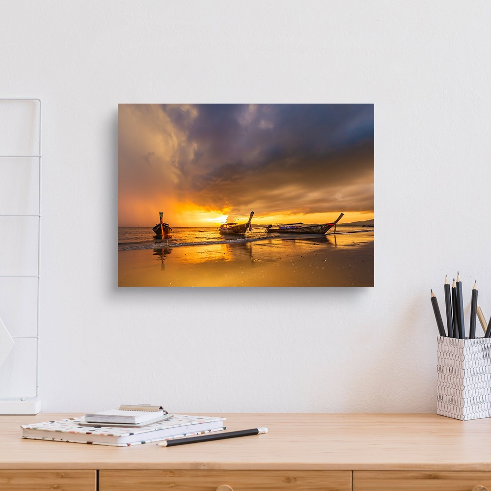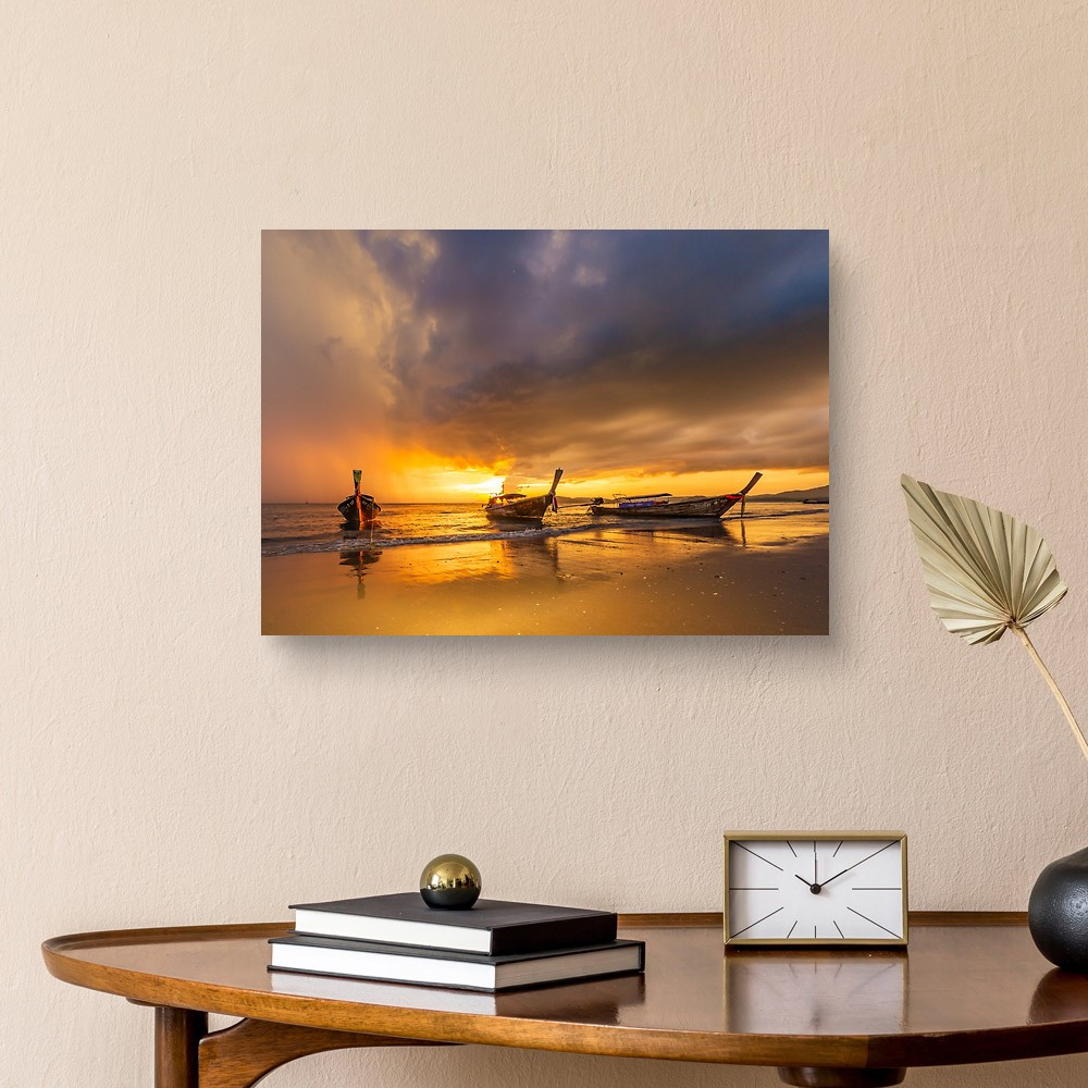 Traditional Thai Boats At Sunset Beach Canvas Print
