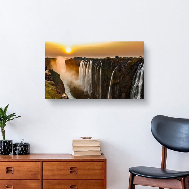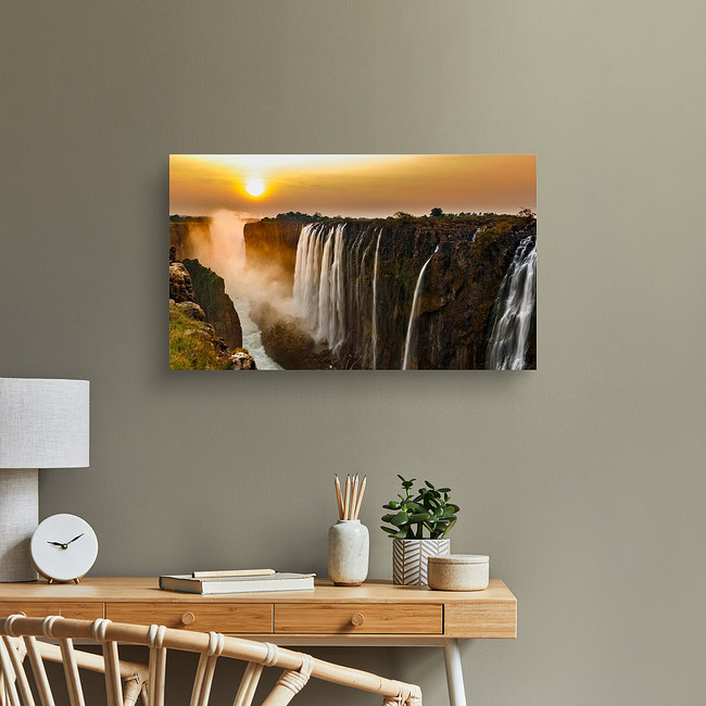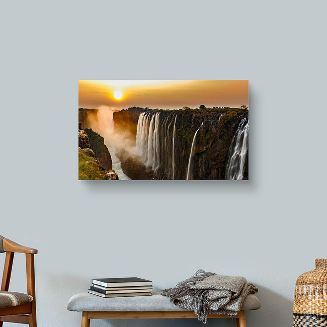 Wide Panorama Of Victoria Falls At Sunset With Orange Sun In The Sky... Canvas Print