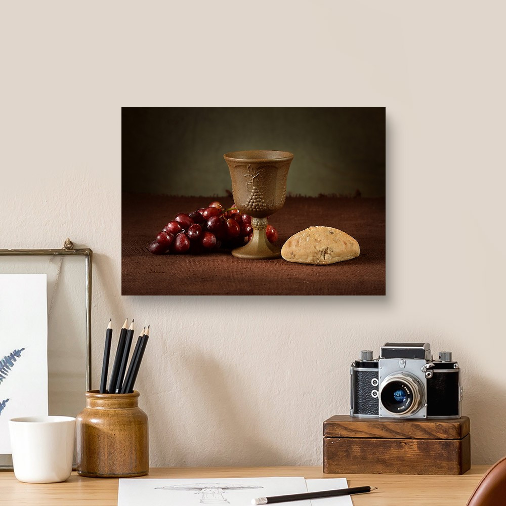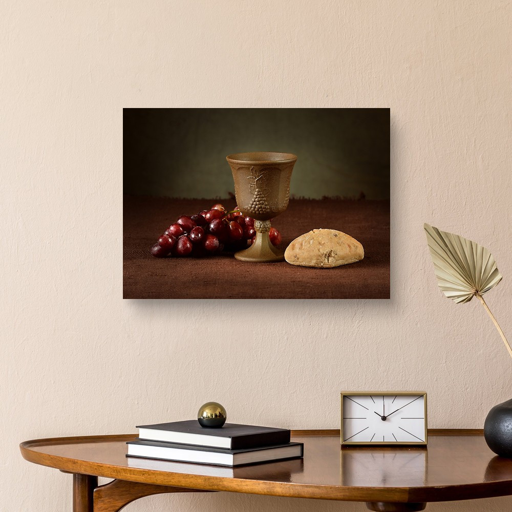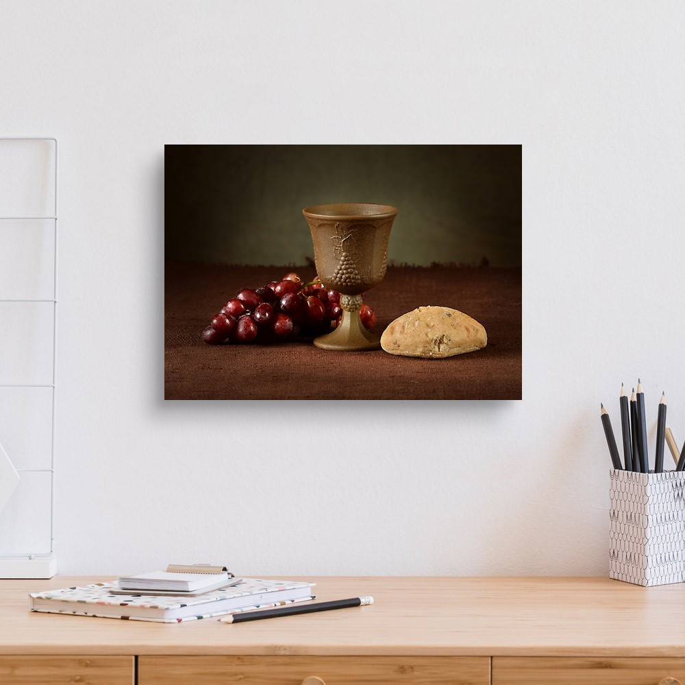 Wine Cup Surrounded By Bread And Grapes As Symbols Of Communion Canvas Print