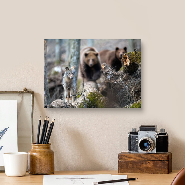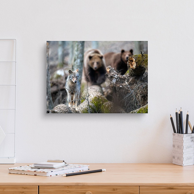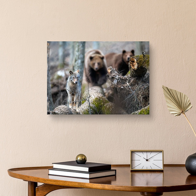 Wolf On A Fallen Tree With Two Bears In The Background Canvas Print