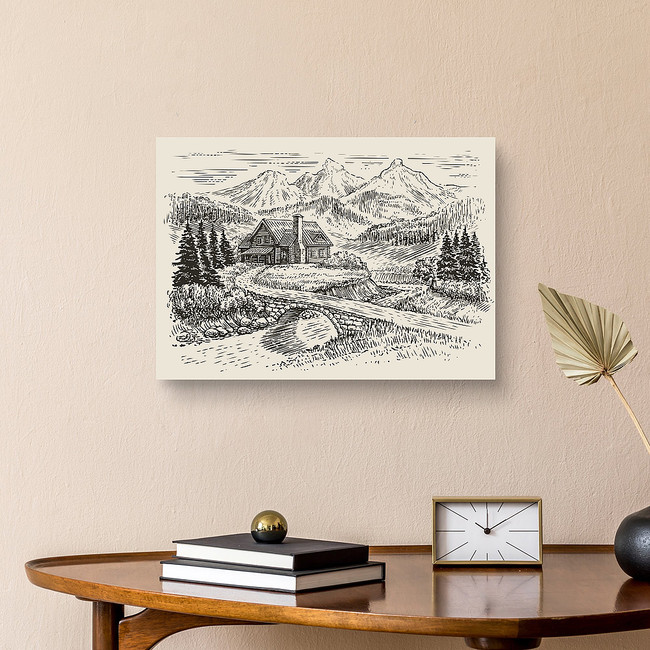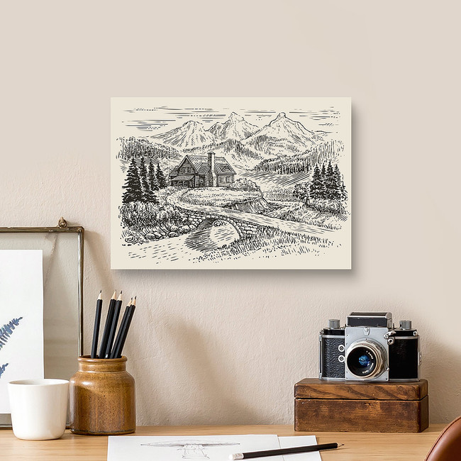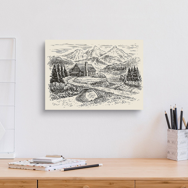 Wooden Cabin In Pine Forest. Mountain Landscape, Rest At Nature Sketch Canvas Print