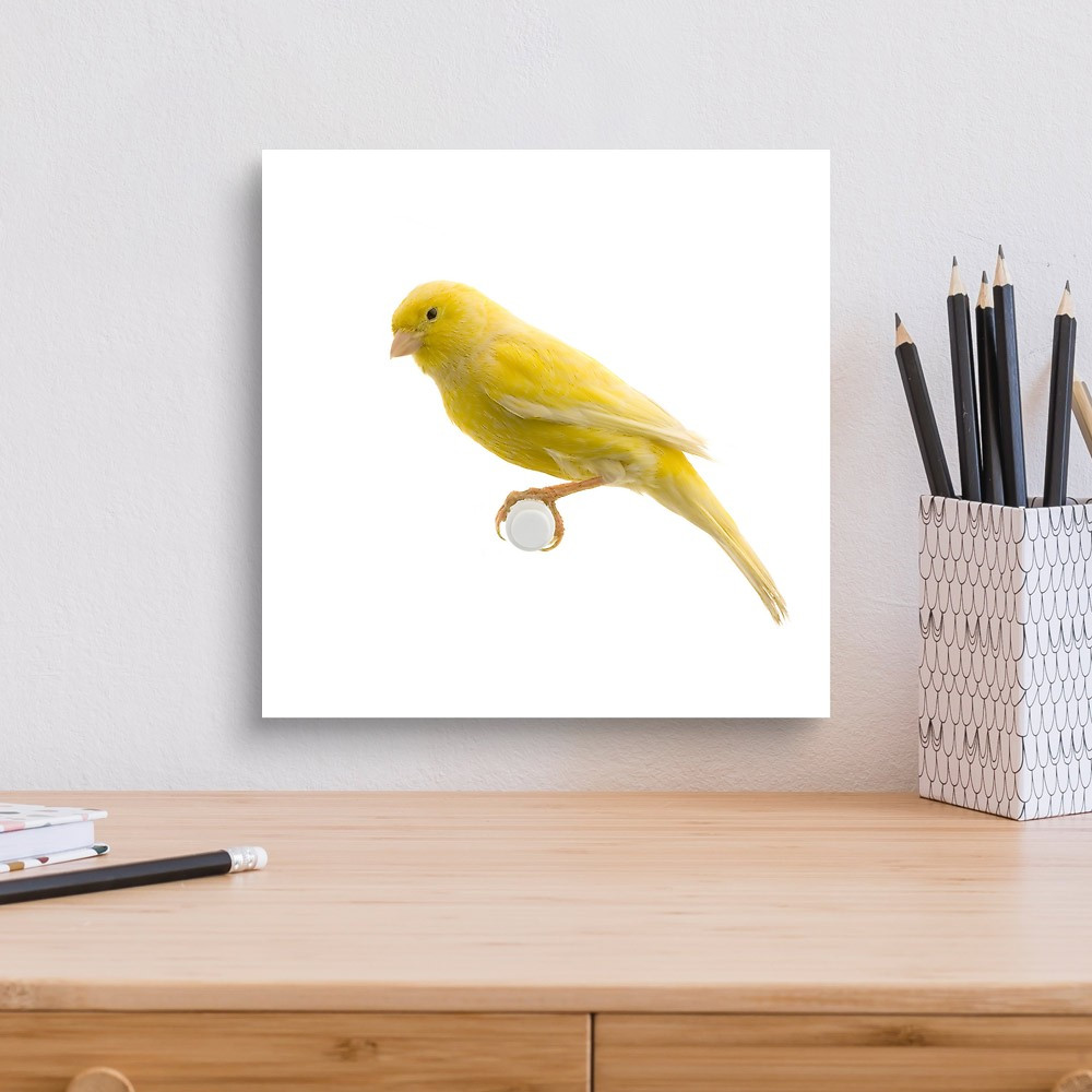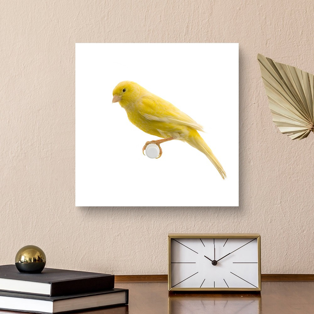 Yellow Canary On Its Perch In Front Of A White Background Canvas Print